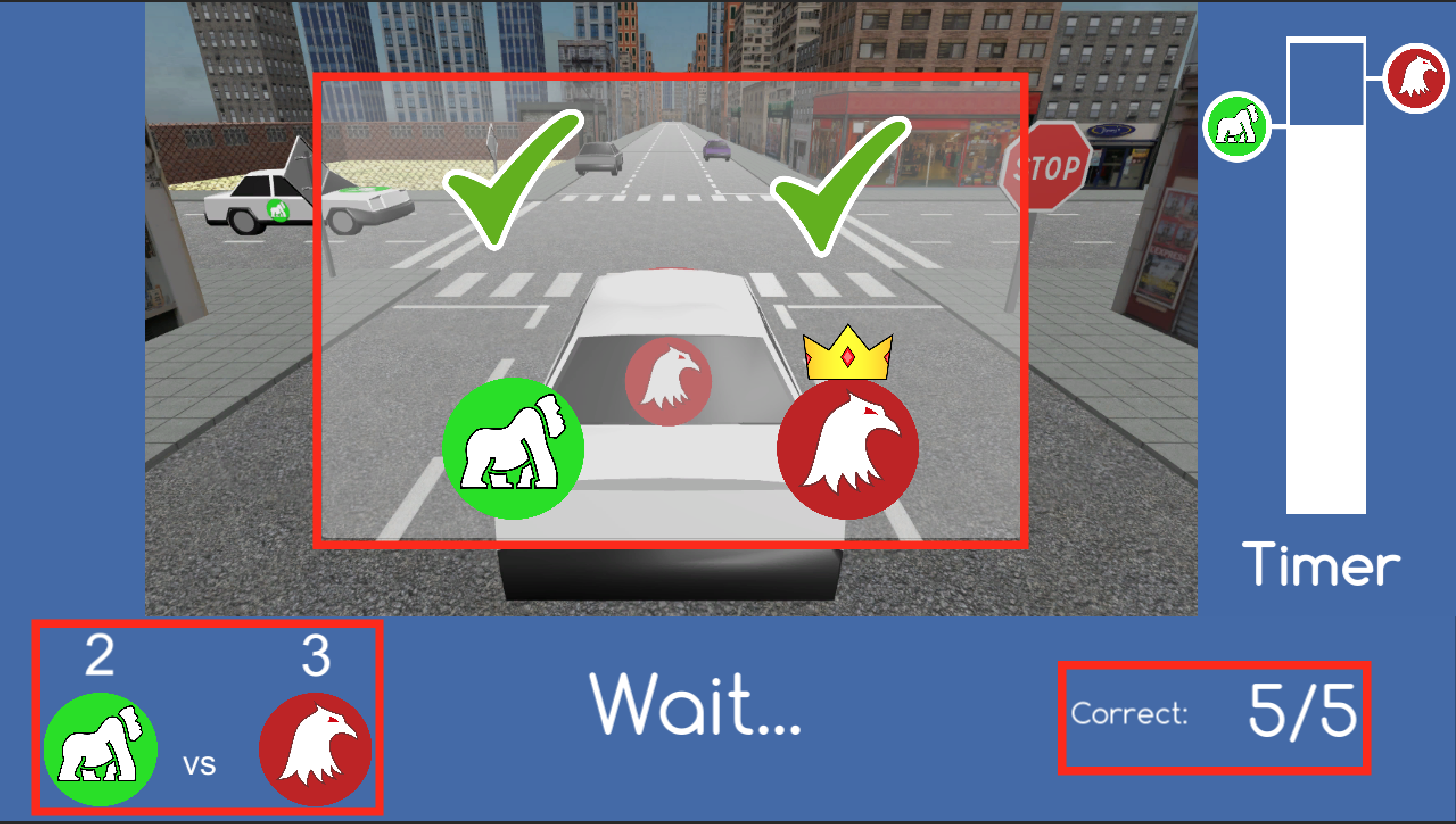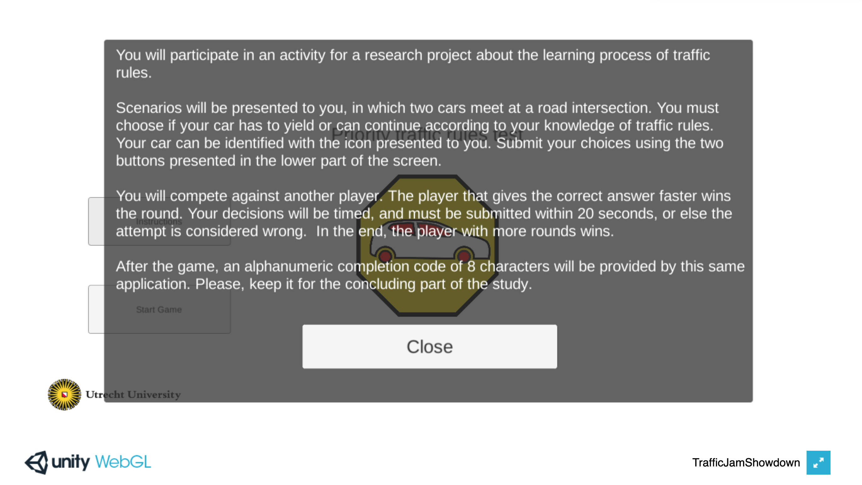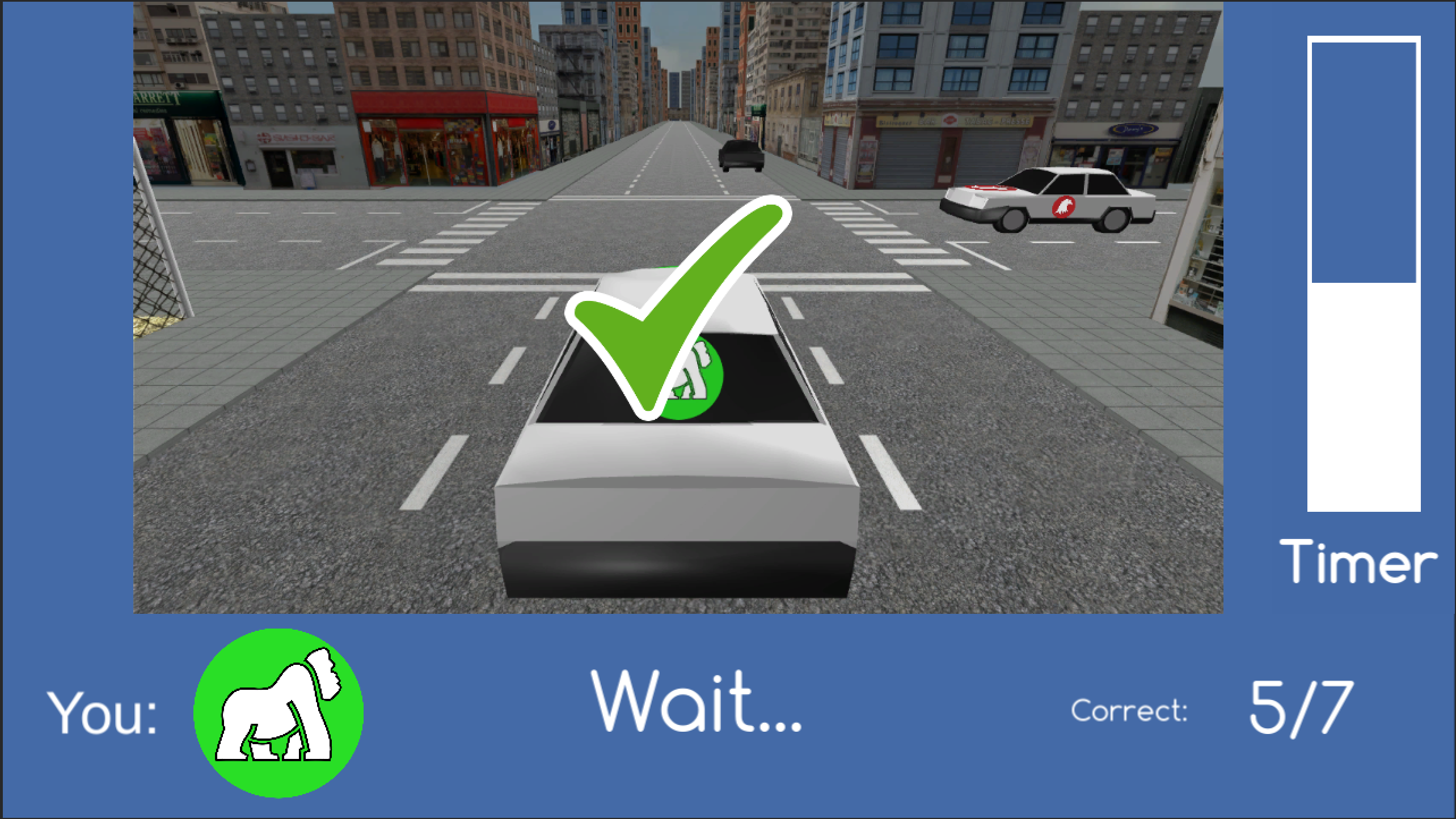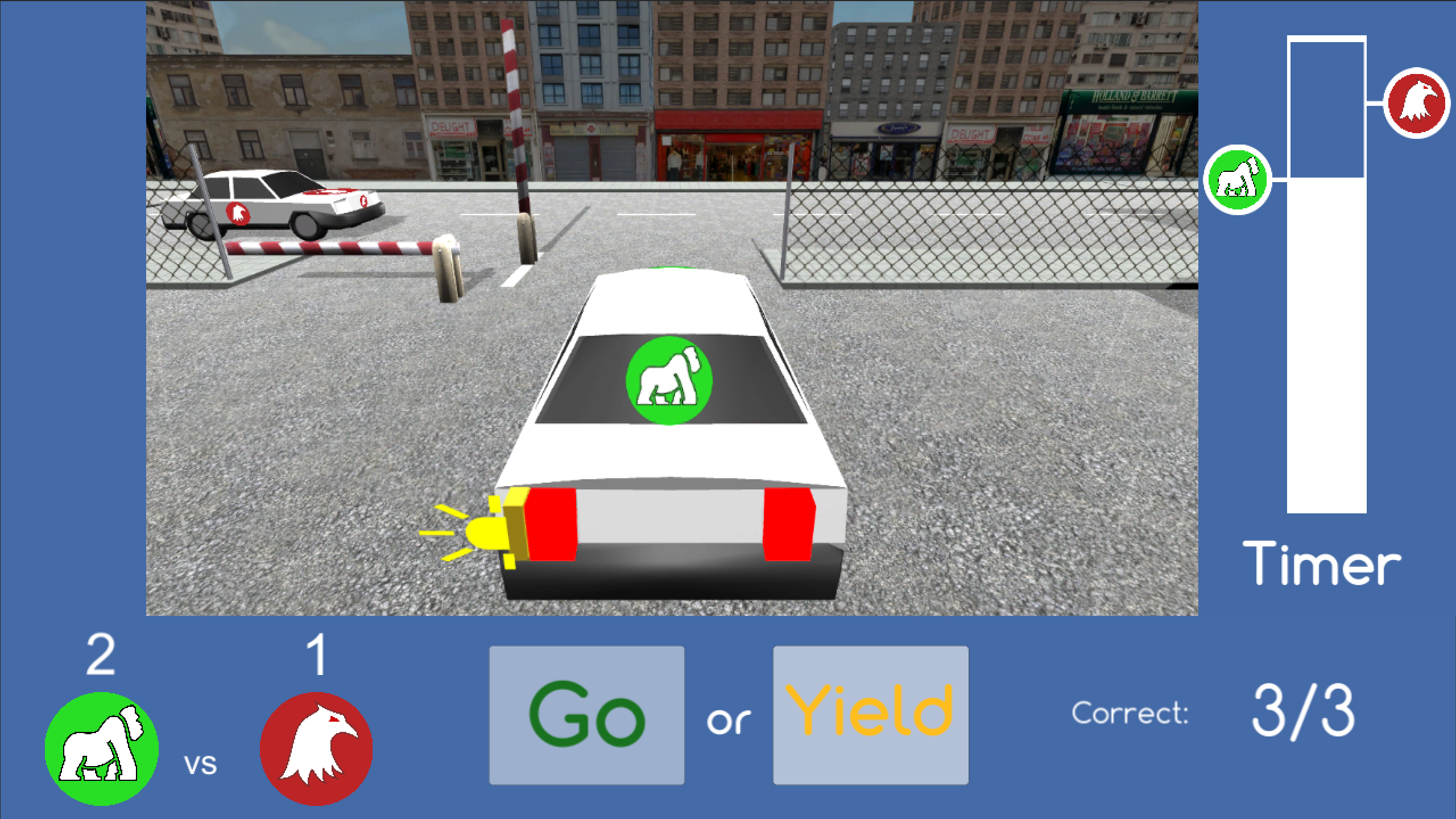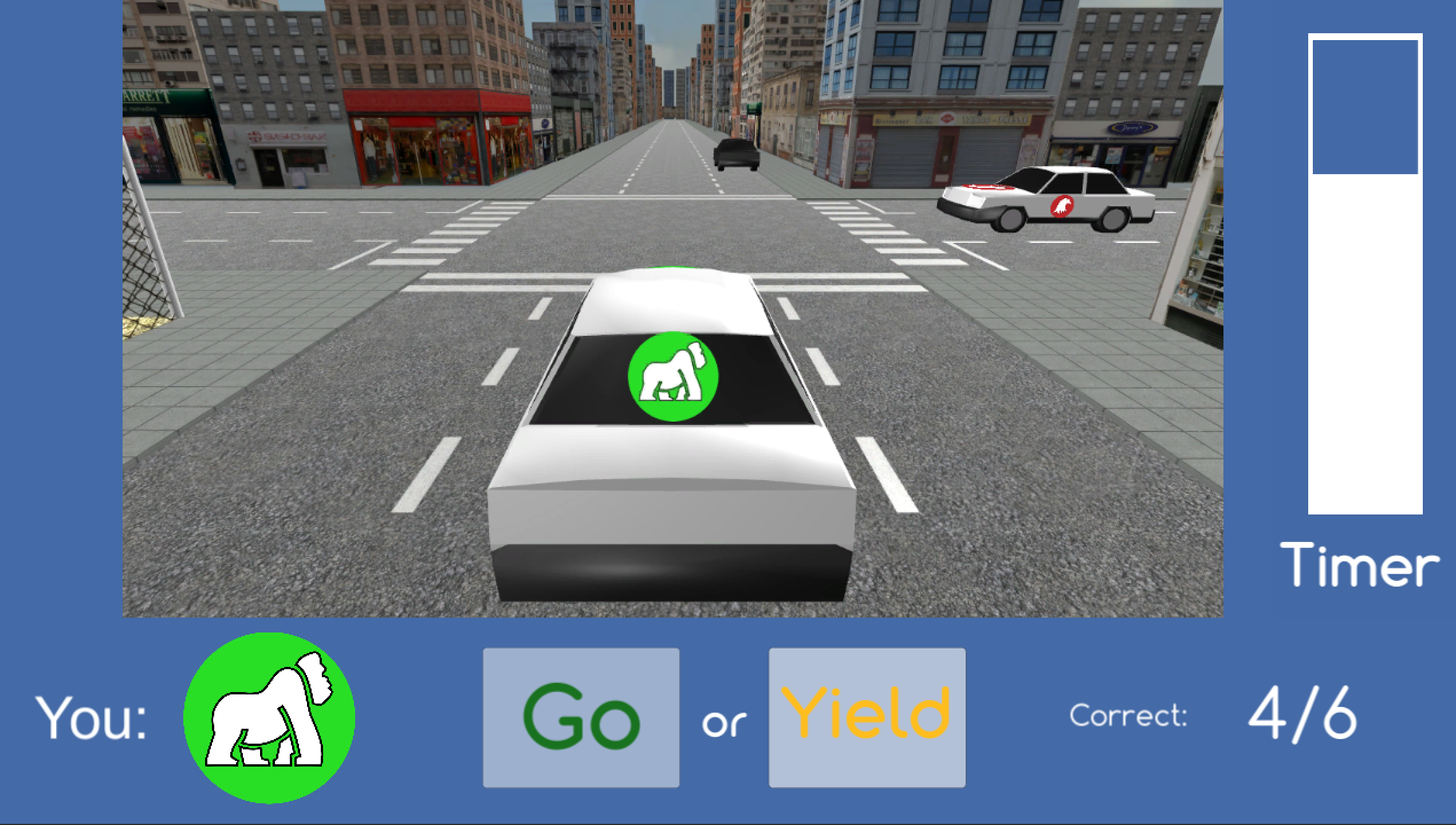 A prototype game was created to test the effects of the desired design elements of this thesis. In a similar manner to other tools used to practice for driving tests, the game presents users with a series of scenes depicting a situation with two cars at an intersection. The player always represents the same car, identified by an icon on the car. They must choose the appropiate action to take in that situation. The two possible answers are GO, to keep on their way, and YIELD, to wait for the other car to pass. This decision must be taken in a timely manner, indicated by the player in the form of a countdown timer. Their choice is evaluated and they are informed by the game if it is correct or not.