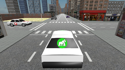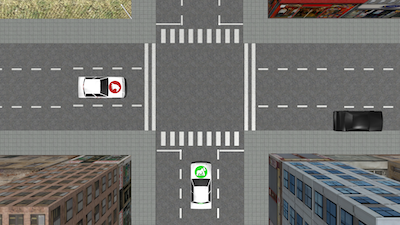 The scenes represent typical situations covered in driving regulations. The users must observe the situation of the two cars and the environment to make a choice on what would be the correct action. To test the effects of different visual perspectives, each situation is presented from three different views- Bird-eye view: All the elements are observed from above. This is the most traditional view used for this type of activity.